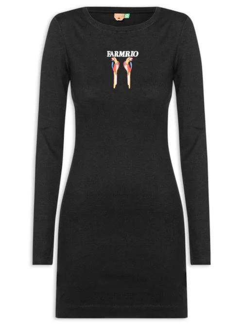 VESTIDO FARM MANGA LONGA BORDADO ARARAS PRETO
